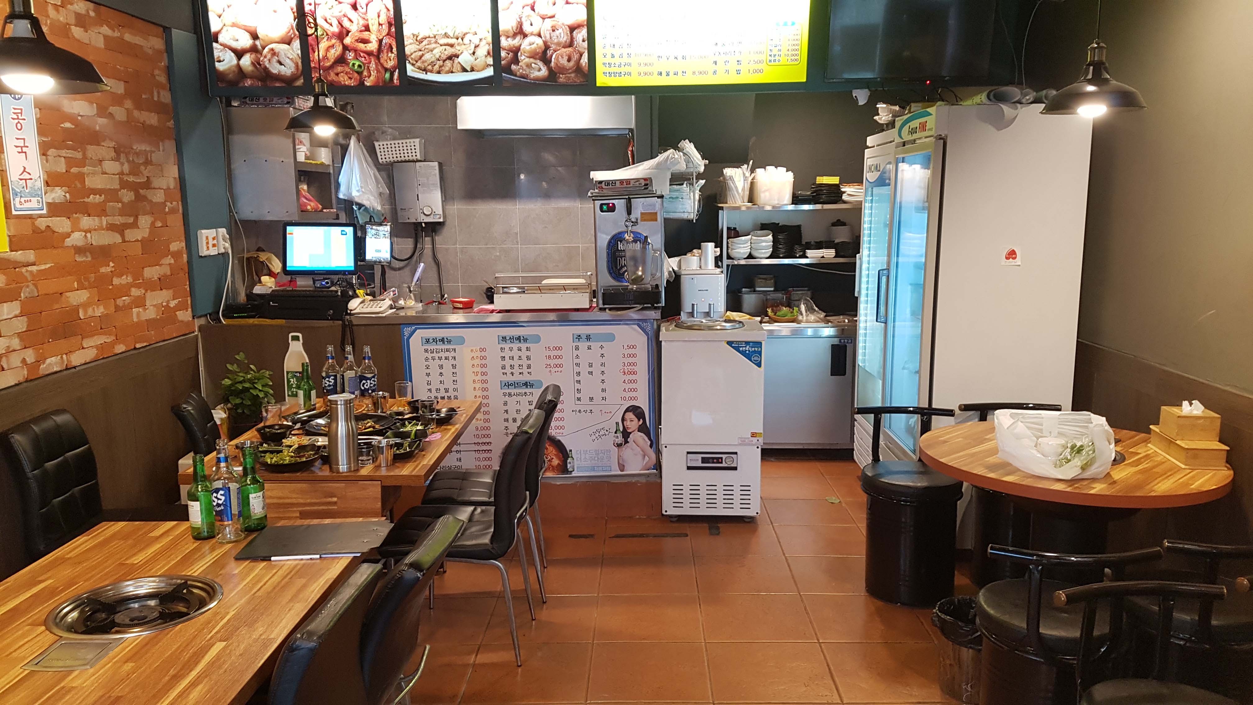 실내에는 5개정도의 테이블이 있는데 저희는 밖에다가 자리를 펴주셔서 실외에서 먹었습니다.돼지곱창을 전문으로 하는것 같은데 입간판의 메뉴를 보니 의외로 포차에서 파는 메뉴들이 많이 있더라구요.